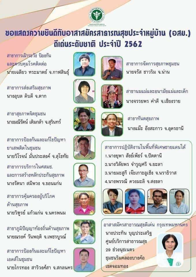 ร่วมแสดงความยินดี Posted on 06/03/2019 by Admin ร่วมแสดงความยินดีกับ อสม. ดีเด่นระดับชาติ นางรัตนา สมีพวง อสม.ดีเด่นประจำปี 2562 ระดับชาติ สาขาการบริการในศูนย์สาธารณสุขมูลฐานชุมชน (คสมช.)
